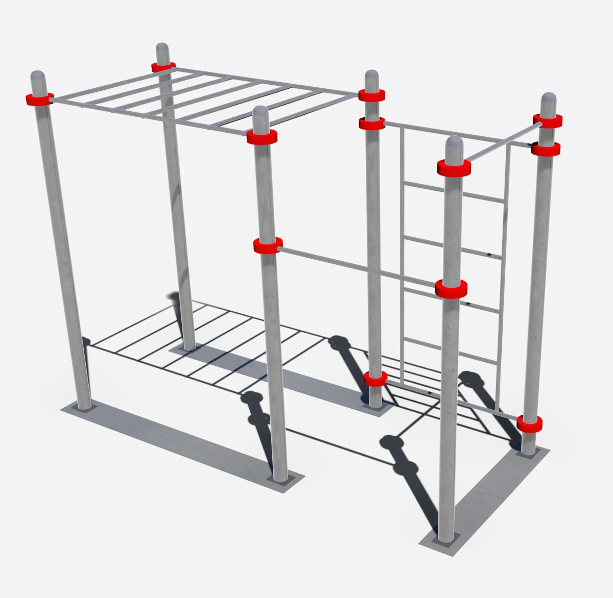 Столбы высотой 5 шт. - 2600 мм, 1 шт. – 2300 мм являются опорой для крепления конструкций. Шведская стенка фиксируется к опорным столбам при помощи хомутов, на высоте 2450 мм.