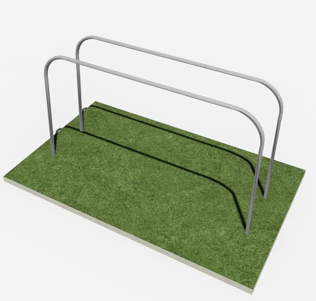 Брусья расположены параллельно, расстояние между внутренними поверхностями жердей 500 мм. Рабочая поверхность составляет 1800 мм. Высота конструкции 1200 мм от уровня поверхности. Длина комплекса не более 2100 мм.