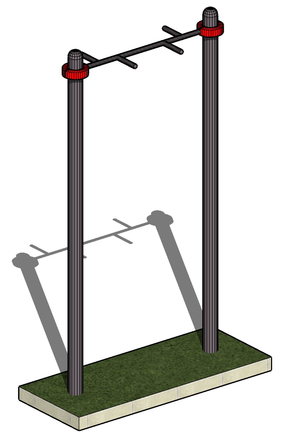 Опорные столбы высотой 2600 мм в количестве 2 единиц, перекладина, расположенная на высоте 2500 мм от поверхности основания. Перекладина крепится к опорным столбам при помощи хомутов. Длина комплекса не более 1400 мм. Перекладина турника «Молоток» для неклассического подтягивания.